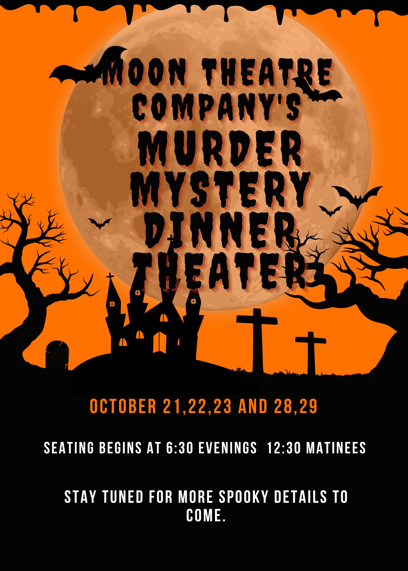 A murder has been committed at an audition for a play at a Berthoud Community Theater. We need your help to determine who is responsible for this heinous act. Please come and join Moon Theatre Company for an evening of fun, food and mayhem as we present “An Audition For A Murder” by Lee Mueller and Directed by Angie Robbins. Tickets available for purchase 09/19/2022 through 10/29/2022 . Look for links on our website http://www.moon-theatre.com and our Facebook and Instagram pages.